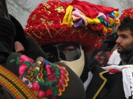 It is very cold outside, the sky is dark and air misty. The colours of Balari create a strong chromatic quite paradoxical impact with the surroundings. The hands of the musicians are frozen and I wonder how they can resist for a whole day, the dancers at least have the body wrapped in thick clothes, elegant white gloves, plastic and paper masks. Dancing they can also drive the cold. The musicians warm themselves with their love for the carnival. The show, although replicated for two days, is always exciting and high-level. The repertoire is composed by 24 dances, full of complicated choreographies conveying ancient symbols of challenges, courtship, erotic acts, court dances. Therefore It is necessary a long period of rehearsals before the carnival. The alternation of the dances is determined by the "chief dancer" who is the only unmasked using horn trumpet to gather the group and call to order. Certainly in the ballet there are military elements. Women are not allowed to dance and men can do it only when they are fourteen years old. There is another corps de ballet composed by women and children but they never perform in these two days.